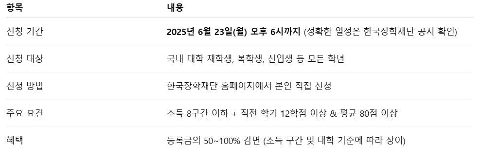 국가장학금은 *"신청자만 받을 수 있는 제도"*입니다. 아무리 요건이 충족되어도 신청하지 않으면 한 푼도 받을 수 없습니다. 따라서 정해진 기간 내에 반드시 신청하는 것이 가장 중요합니다. 신청은 1년에 두 번이며, 반드시 정해진 기간 내 신청해야만 수혜를 받을 수 있습니다. 특히 2025년 2학기 국가장학금 신청 기간은 2025년 6월 23일(월) 오후 6시까지입니다.